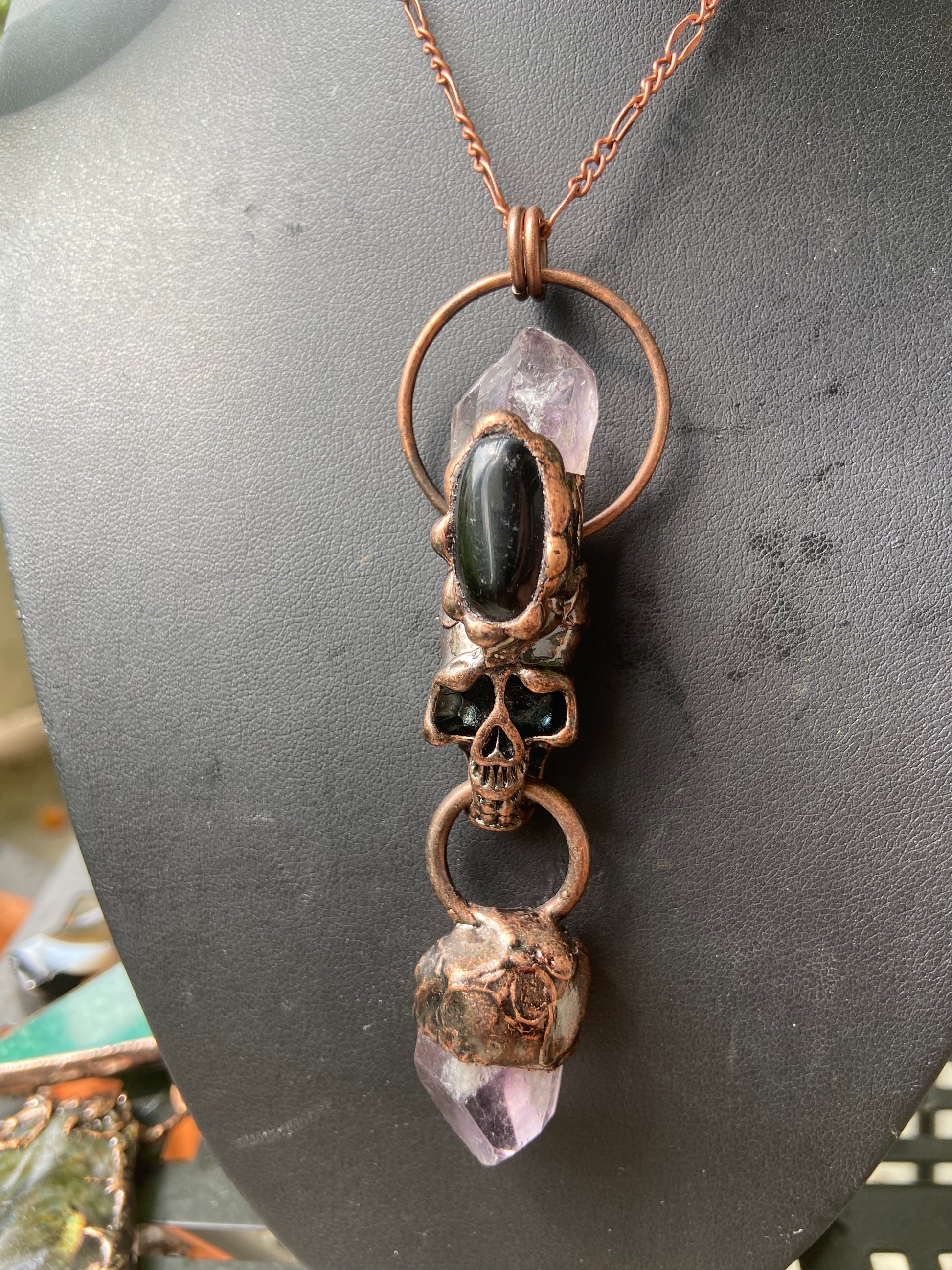 An electroformed skill with an black obsidian hat amethyst sitting in the hat and hanging from the mouth.