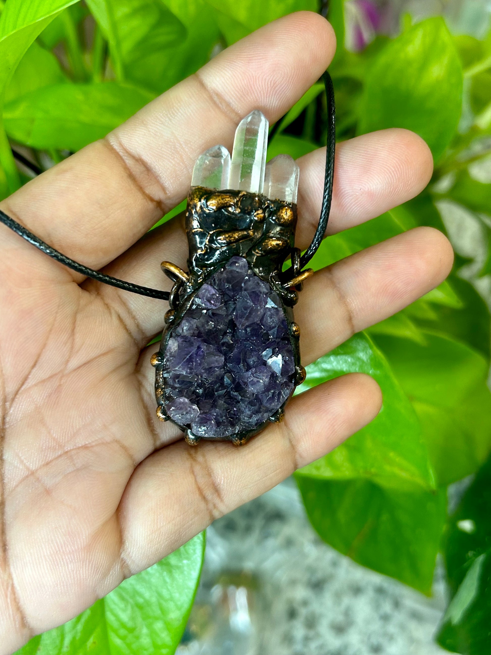 Electroformed necklace with an amethyst geode and 3 amethyst points.