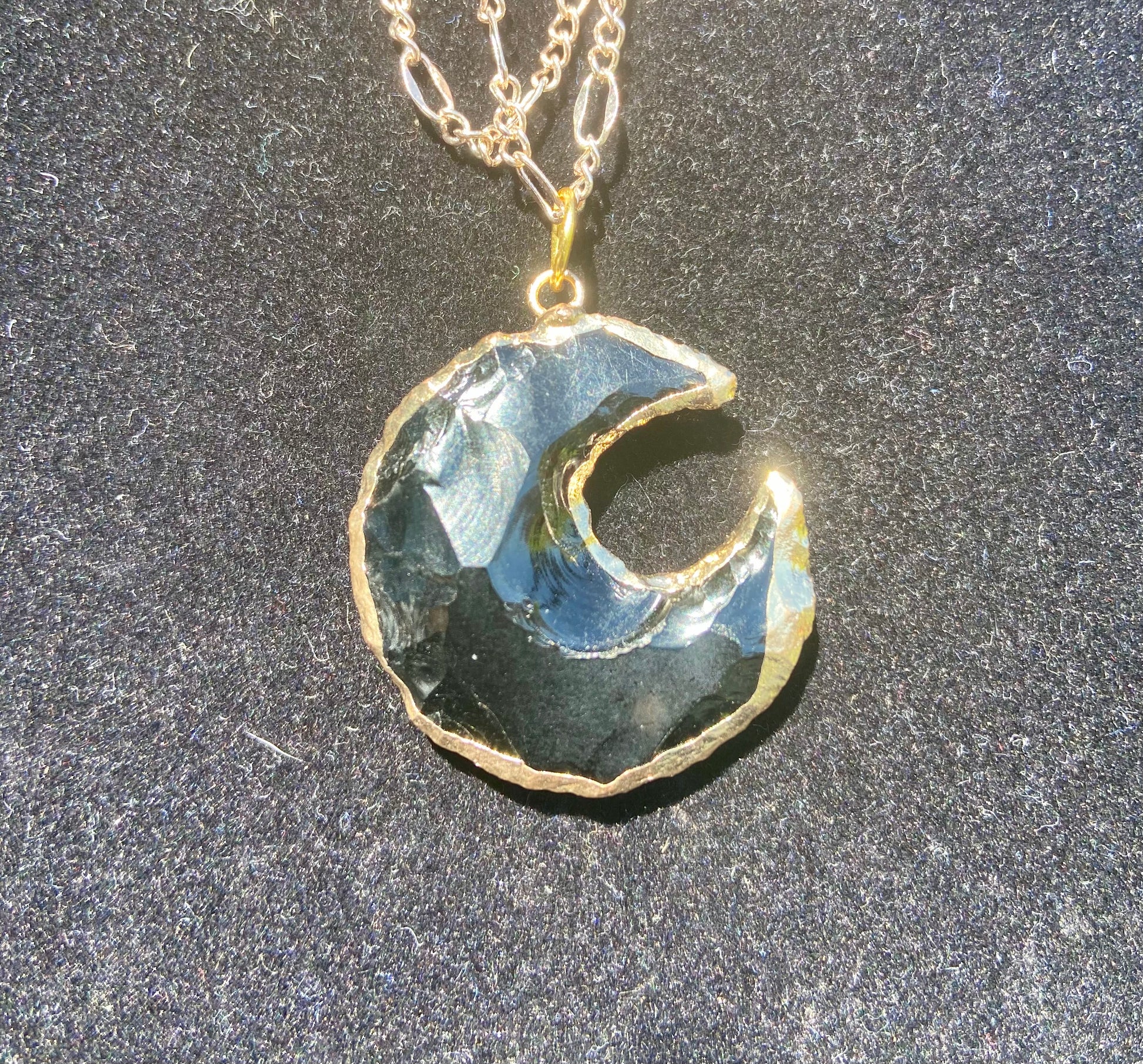 This is a rough carved black obsidian moon back lace with a gold outline…