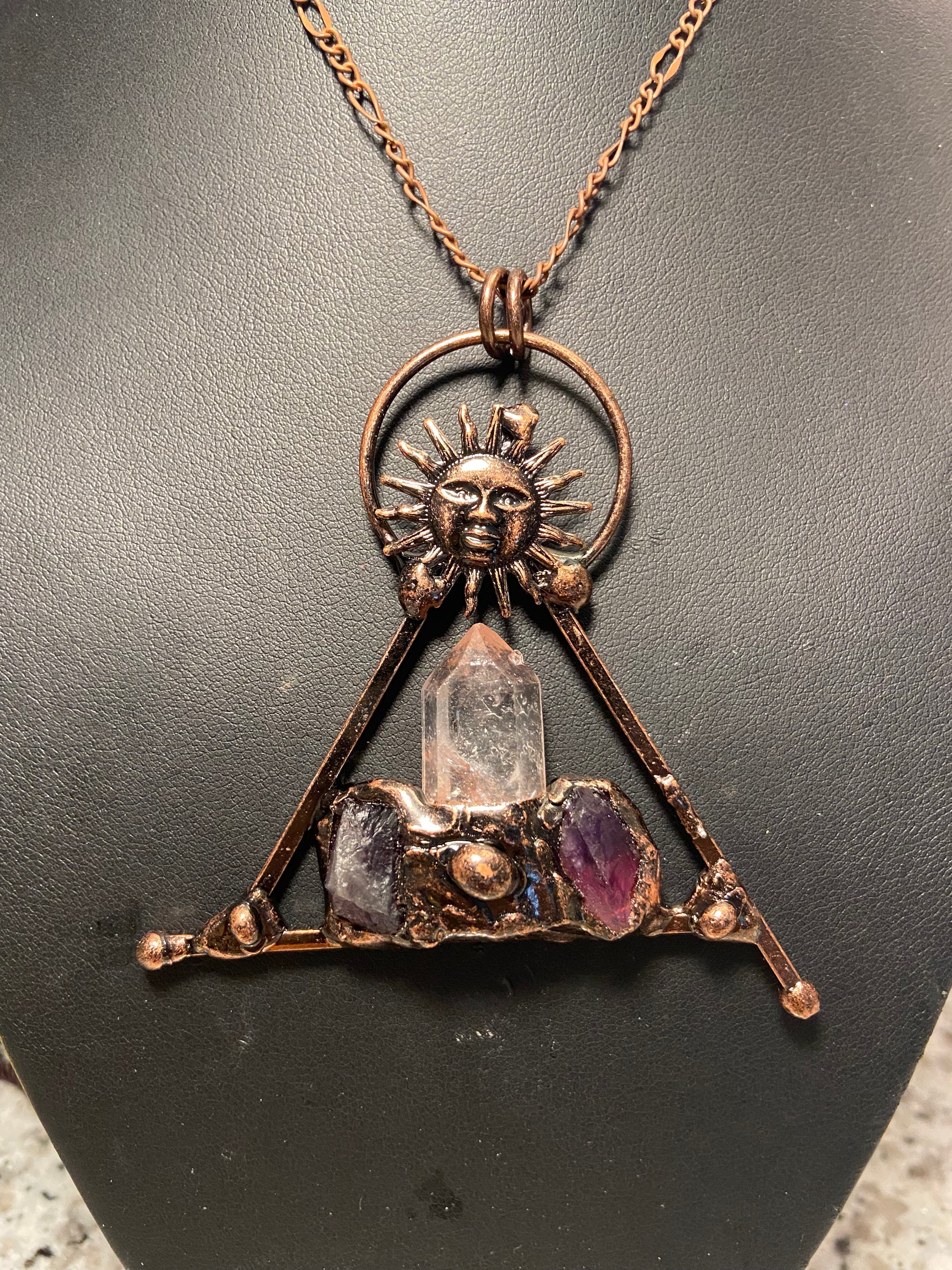 This necklace is a custom. Soldered and electroformed with clear Quartz and Amethyst inclusions.