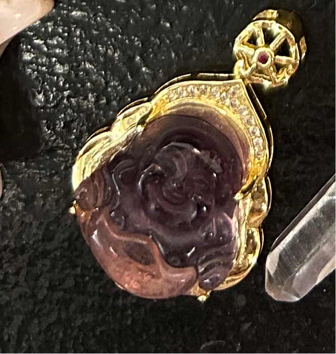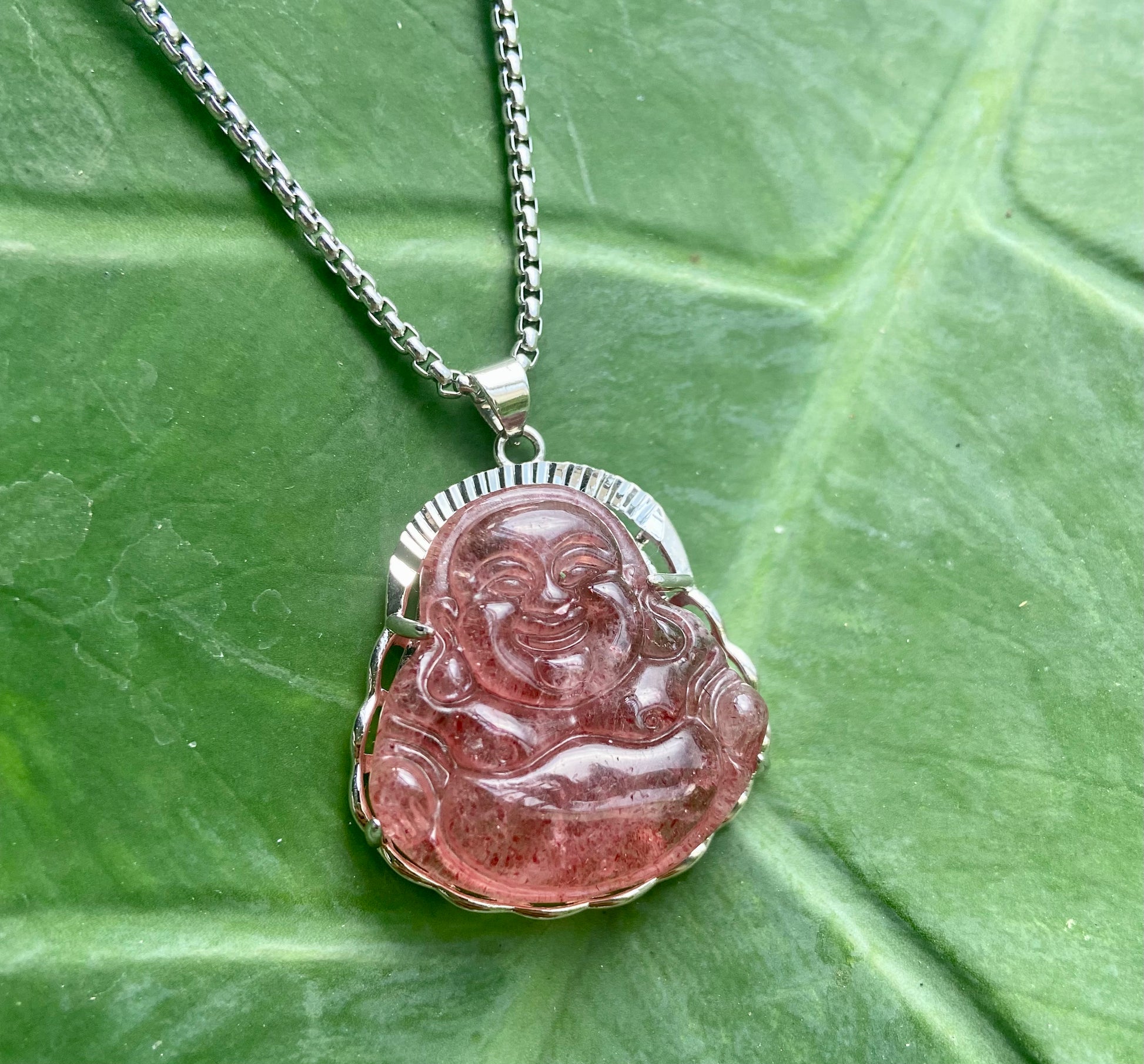 The laughing Buddha is a talisman many carry on them for good luck. Cherry-Quartz is created using natural reconstituted quartz and cinnabar. It’s then melted and given its dazzling energetic flashes or pink color in the clear quartz.