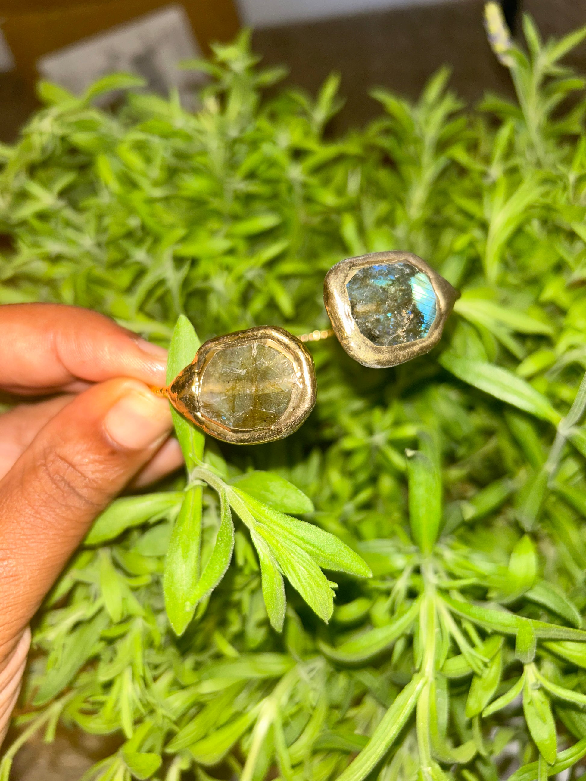 Adjustable gold bangle with Amazonite, pearl and moonstone inlays.