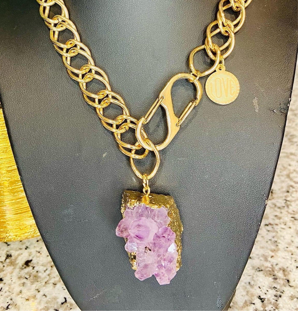 A gold plated chain necklace and love charm with a gold plated amethyst geode.